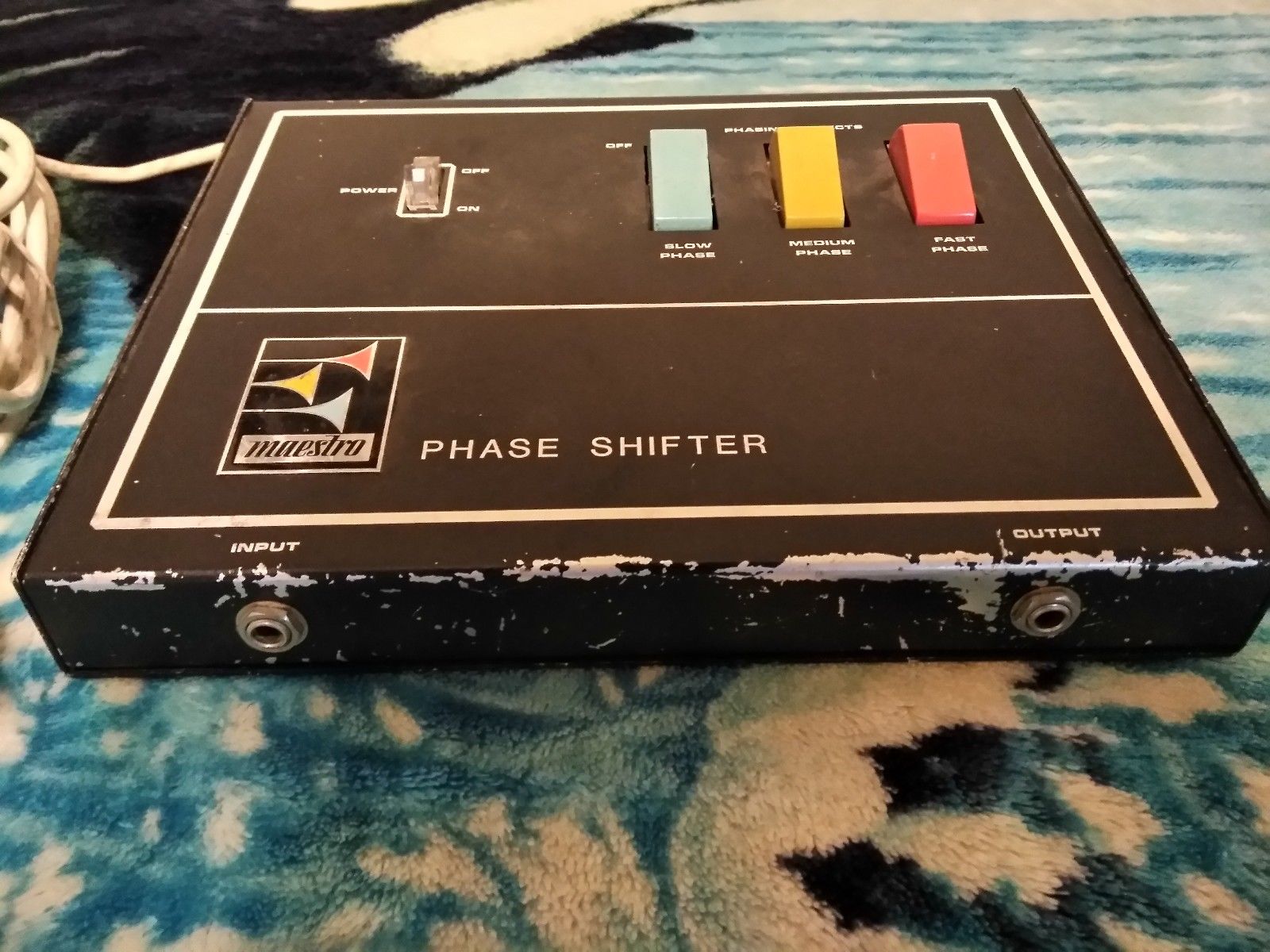 Musically, this is pretty cool. Pete's got the duty of holding down the fort with a series of four barre chords and some fast-moving changes while I play the lead guitar melody and the heavy, phase-shifted guitar. I had an MXR distortion+ pedal and a Maestro Phase Shifter box that looked like this (wish I still had it!):