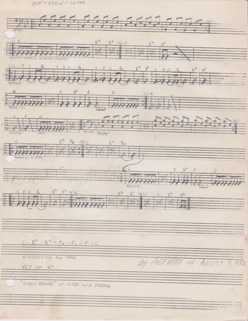 Check out the pics of us above, from 1982, and click the pic for a whole album of old pics. And check out the guitar tablature (and some regular bass clef notation for that rippin' guitar riff!) below.