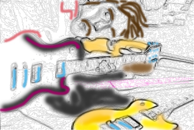 | four guitars | Andy: electric guitar (Sekova!) four tracks, two clean, two mean with distortion+; PlainTalk mic upside down on wrist rest, thumping wrist rest, rubbing it, and tapping the computer keyboard with a long fingernail; vocal. Wierd and wonderful, a spontaneous celebration of my old guitar! (1/5/96) Recorded in 1996 in mangobananas studio, Ithaca, NY. | |