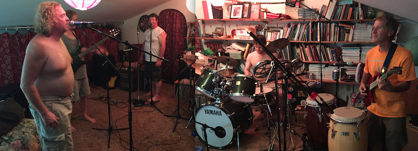 | today's the 35th | Pete - vocals PeBo - electric guitar (R), bvox Tommy - blues harp, bvox Andy - electric guitar (L), bvox Tim - bass, bvox Jon - drums Recorded Thursday 13 August 2015 with the mobile mangobananas studios recording rig in Jon's loft, Ithaca, NY ©2015 Killer Voyage | |