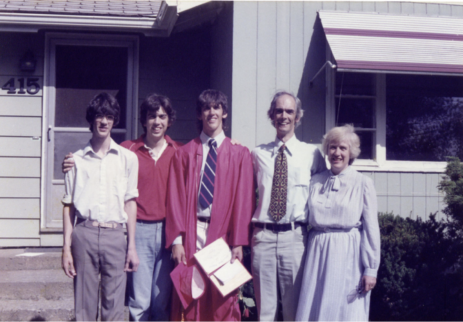 But honestly, I'm a little embarrassed by the schmoozing, self-serving mechanism of "you think I'm so special, well you're even more special". A love song for my self as much as for my girlfriend, perhaps. ;-P But again, I was 17. Spring of my senior year. Here's a picture from graduation in June, with my family in front of our home on Warren Road: James, Doug, me, Dad, Mom: