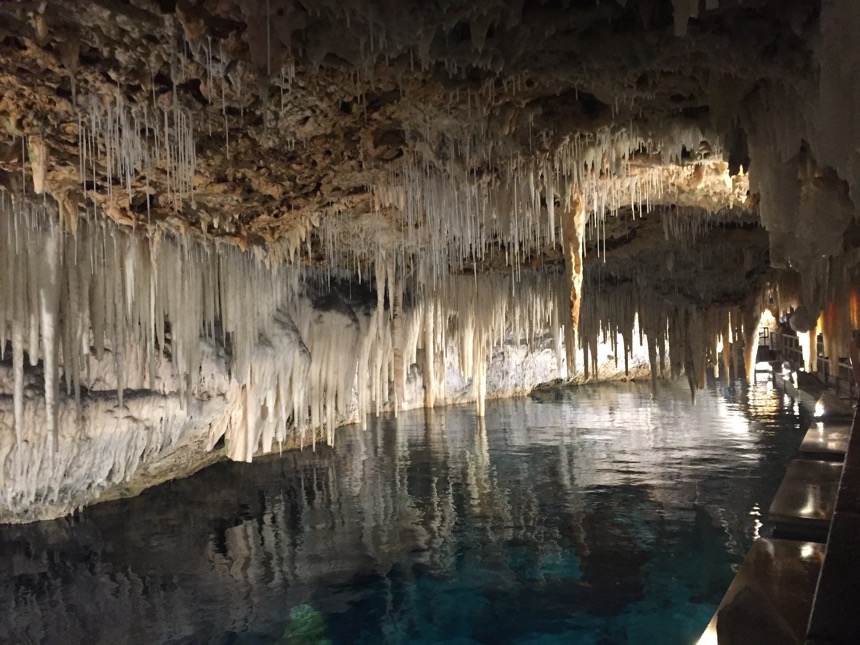 This past July, Barbara and I took a vacation to Bermuda, and visited the Crystal Caves there. The tour guide told the story about the 14-year-old boys losing a cricket ball down a hole, and getting a rope and lanterns and decending down a hole and discovering this big underground pool, with beautiful soda-straw stalactites.