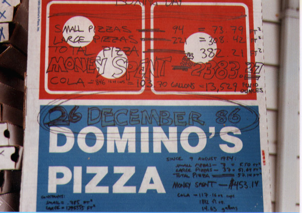 We were in a nameless limbo that summer, having decided we were tired of the bug spray jokes and punk associations (Black Flag), and before the Nines gig we decided to call ourselves Everything But Anchovies. The name came from a menu item at Domino's pizza, which was of course a pizza with everything but anchovies. We'd never ordered it, but we'd been ordering pizzas for our Saturday night rehearsals/jams in Jon's basement for years. In fact, we'd recently passed $2000 spent on pizzas, and every box was stacked up behind Jon's drums.