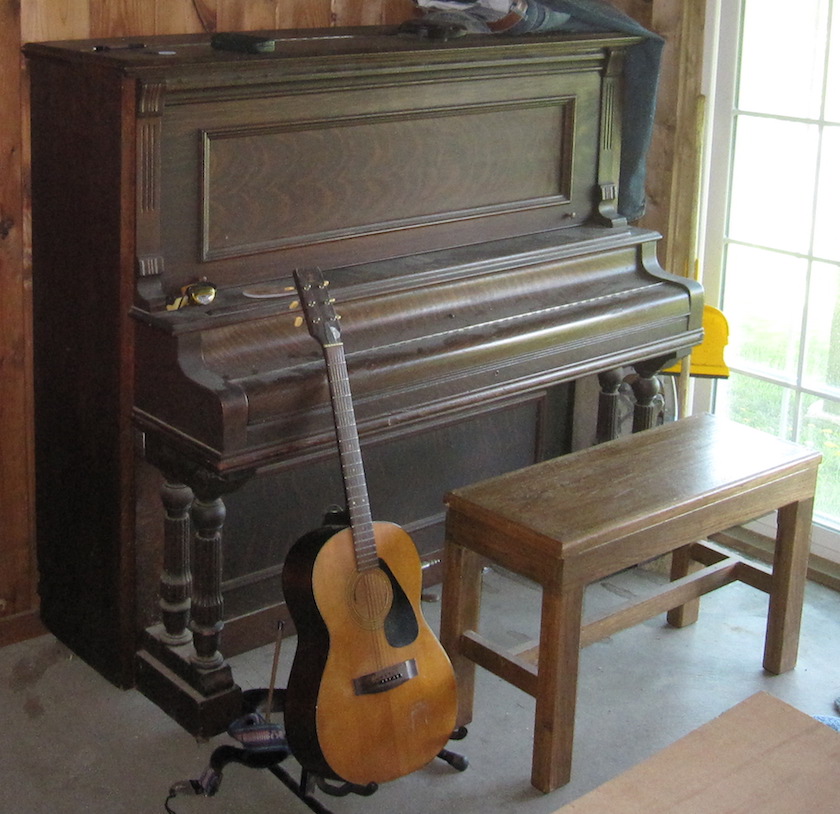 Next I recorded a piano track on my late 1800's Crane Cabinet Grand piano, focusing on a steady reggae plunking. Then I did another piano track with a lot of noodling around with the sustain pedal down. Then I added an organ track played on my older brother Doug's hand-me-down Roland Saturn 09. Then I recorded a bass track. In August I did a rough vocal take, and that kicked around for a few months. In January 2005 I did a new vocal track, and three backup vocal tracks. I finished it off with a percussion track, playing a little wooden frog with a sawtooth back and a stick. That led to the ninth mix, which became the final mix for my album babble on.